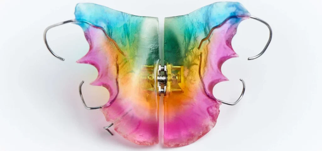 La plaque d’expansion est un appareil orthodontique conçu pour élargir progressivement la mâchoire. Il est composé d’une plaque en résine colorée et d’un vérin central (vis). Son utilisation permet de créer plus d’espace pour un alignement harmonieux des dents.
